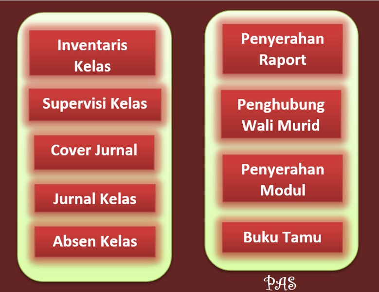 absen kelas, jurnal kelas, buku penyerahan raport, supervisi kelas, dll